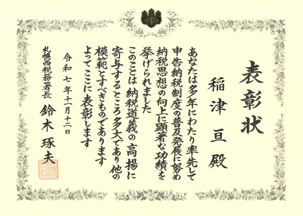 11月12日(水)札幌西税務署が実施する令和7年度納税表彰式において、適正な申告・納税の功績が認められ、納税表彰を受けました。